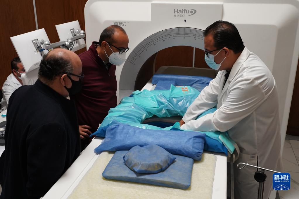 8月23日,在墨西哥普埃布拉州喬盧拉市腫瘤消融醫學中心,重慶海扶醫療的墨方合作醫生向到訪醫生演示“海扶刀”治療系統。新華社記者 朱雨博 攝