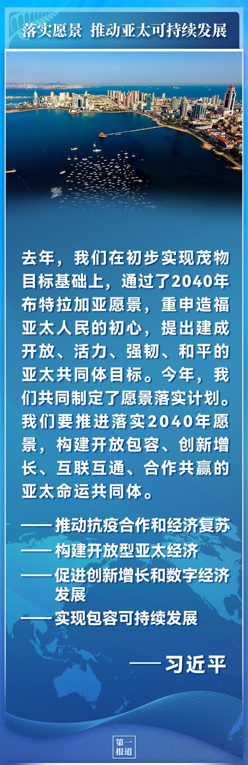 去年,我們在初步實現茂物目標基礎上,通過了2040年布特拉加亞愿景,重申造福亞太人民的初心,提出建成開放、活力、強韌、和平的亞太共同體目標。今年,我們共同制定了愿景落實計劃。我們要推進落實2040年愿景,構建開放包容、創新增長、互聯互通、合作共贏的亞太命運共同體。重點要做好以下幾件事。