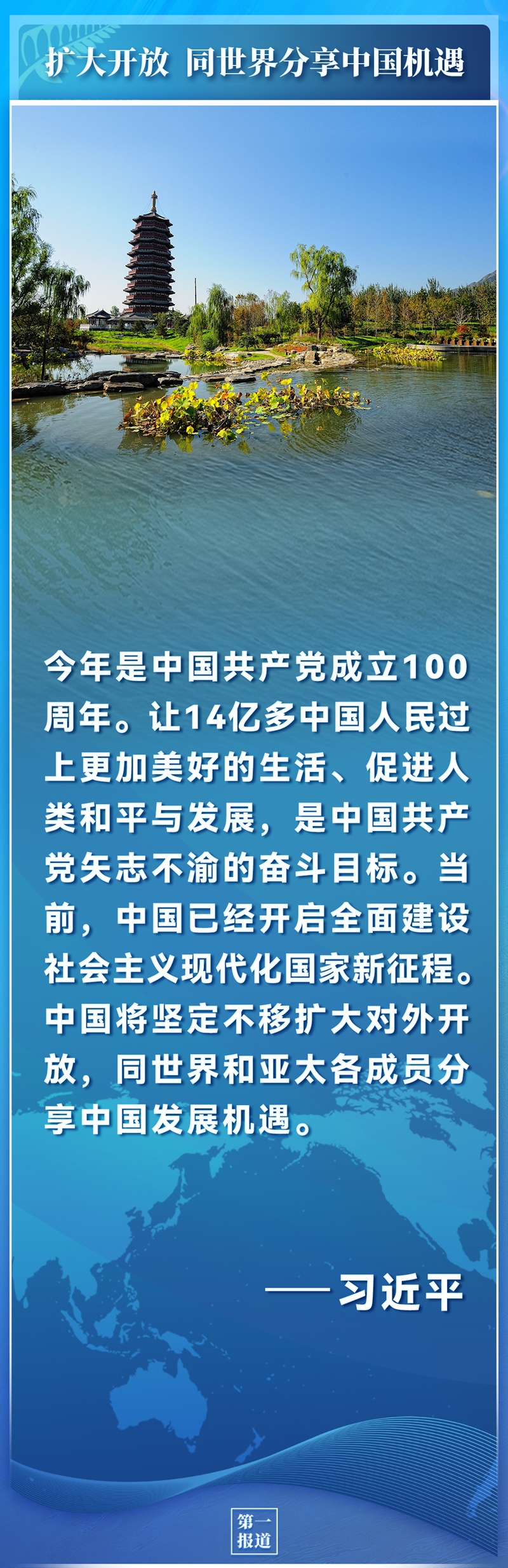 今年是中國共產黨成立100周年。讓14億多中國人民過上更加美好的生活、促進人類和平與發展,是中國共產黨矢志不渝的奮斗目標。當前,中國已經開啟全面建設社會主義現代化國家新征程。中國將堅定不移擴大對外開放,同世界和亞太各成員分享中國發展機遇。