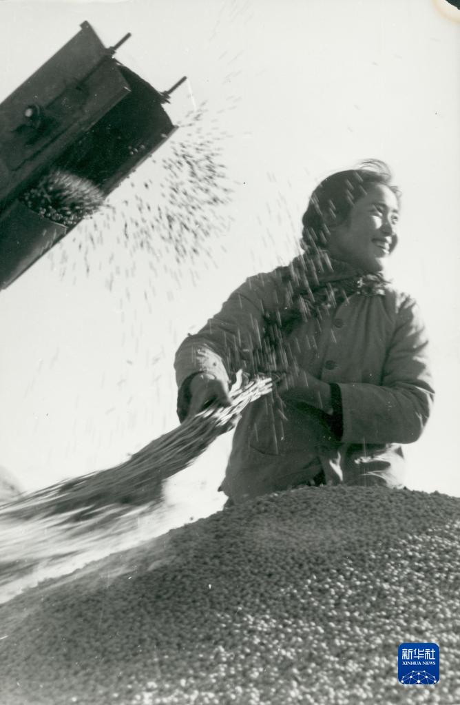 1970年,黑龍江墾區職工享受大豆豐收的喜悅(資料照片)。新華社發