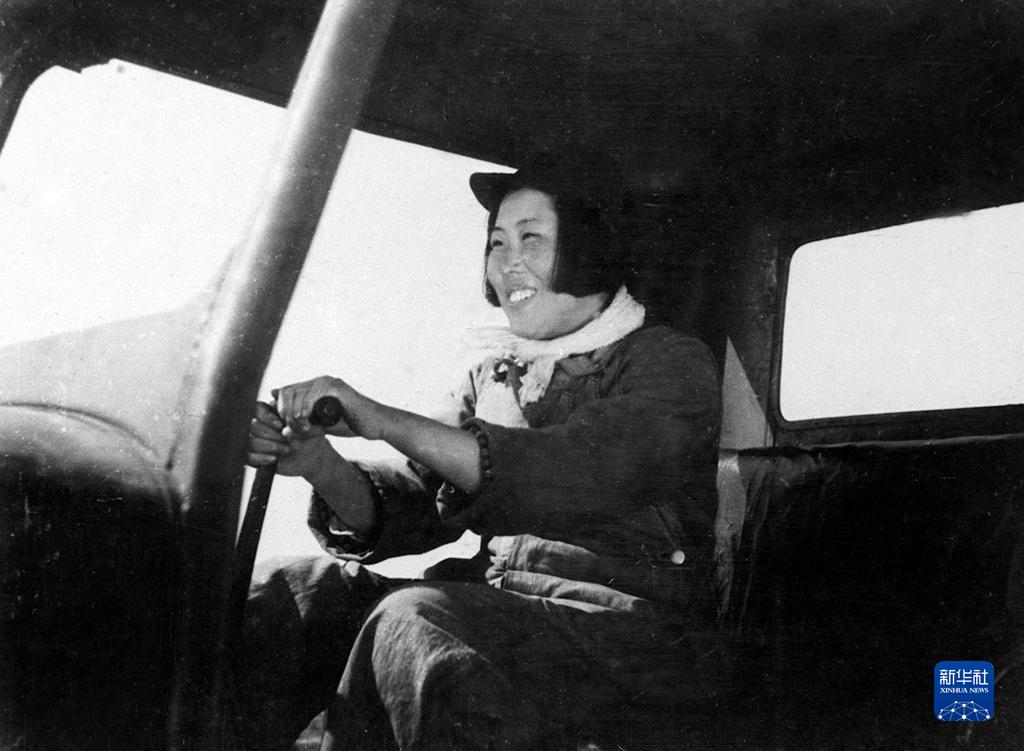 這是梁軍在駕駛拖拉機(1950年攝)。新華社發
