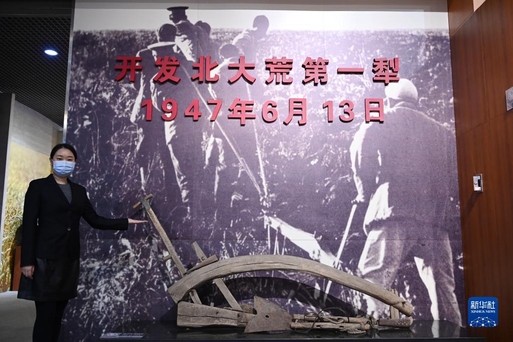 在北大荒博物館,工作人員介紹開發北大荒第一犁的歷史(2021年3月10日攝)。新華社記者王建威攝