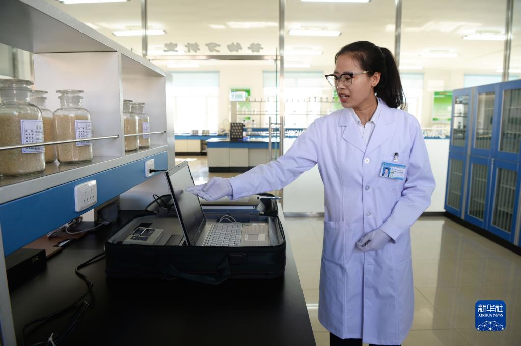 黑龍江北大荒建三江國家農業科技園區工作人員裴鑫宇在做谷物品質檢測(2018年9月27日攝)。新華社記者 王凱 攝