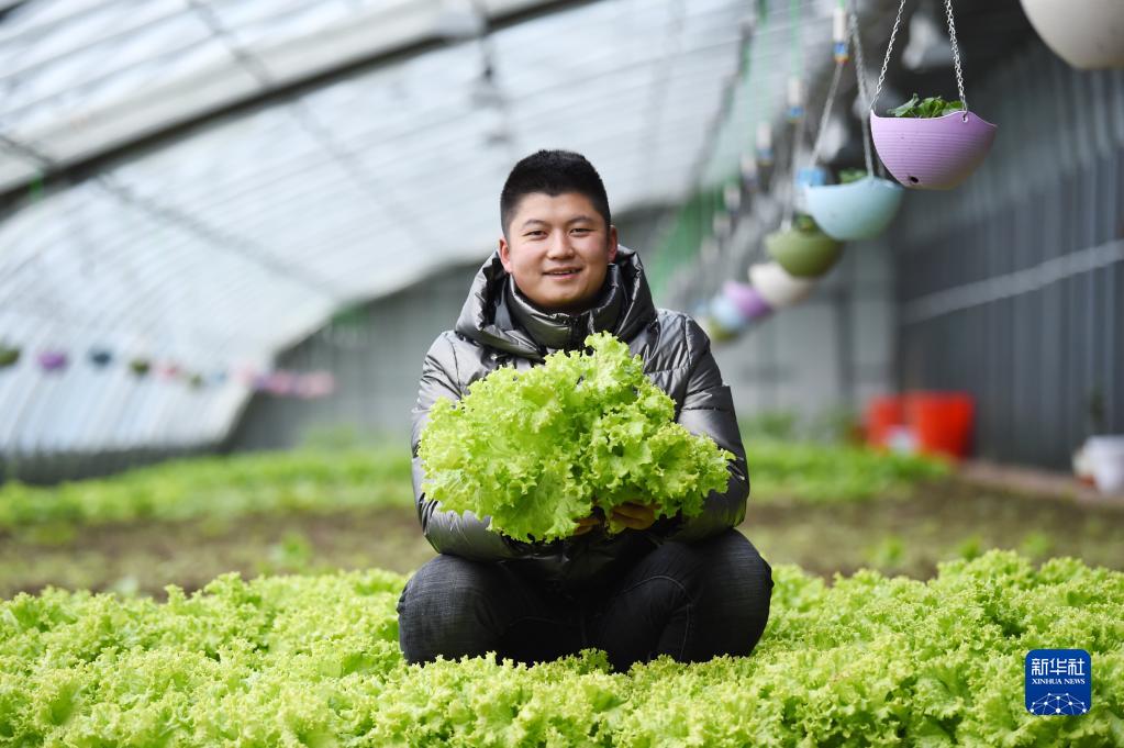 在黑龍江北大荒農墾集團雙峰農場有限公司果蔬產業園區智控溫室,工作人員在展示剛采摘的生菜(2021年3月5日攝)。新華社記者 王建威 攝