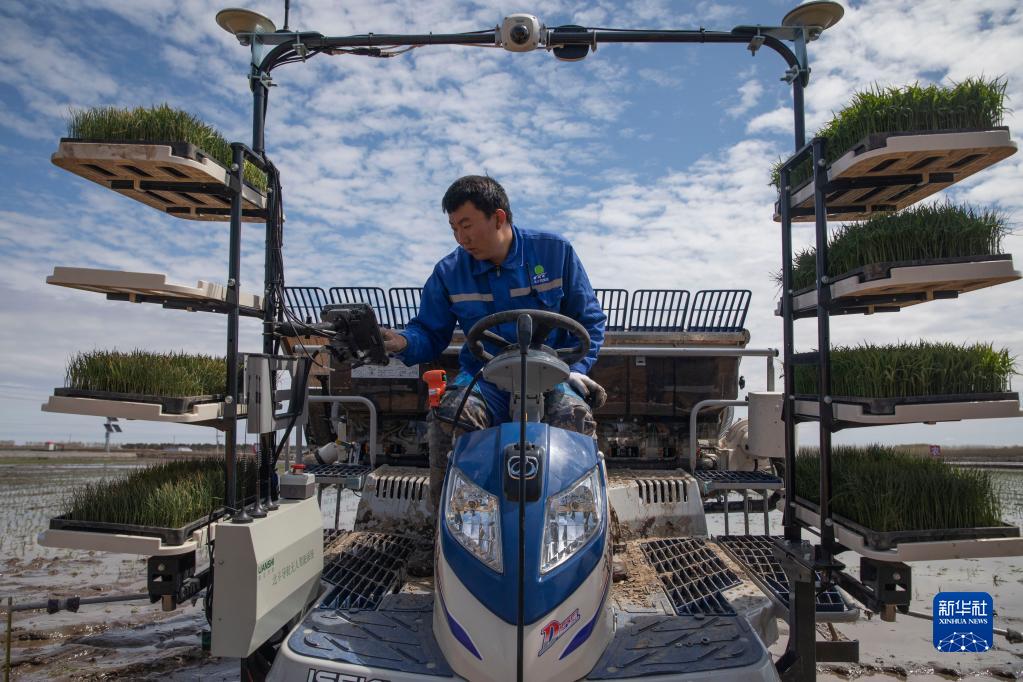 在北大荒集團紅衛農場有限公司智慧農業先行示范區內,工作人員設置無人駕駛插秧機工作路徑(2021年5月11日攝)。新華社記者 張濤 攝