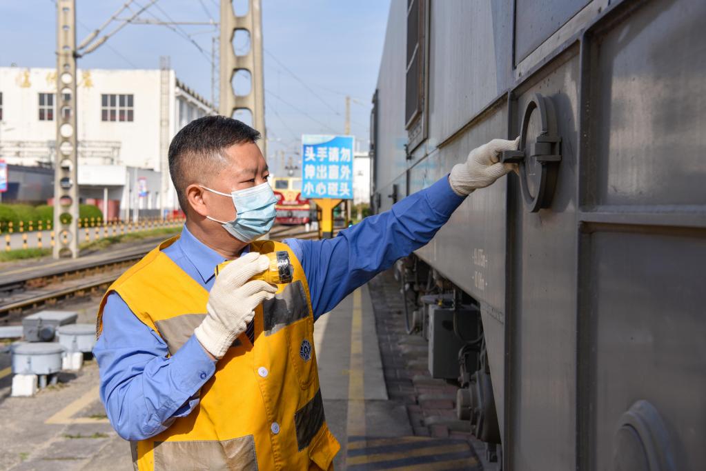 11月23日,胡勇在接車后檢查機(jī)車走行部。新華社記者胥冰潔攝