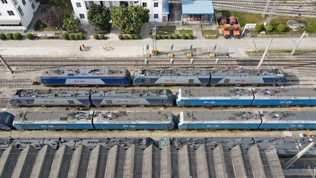 這是11月23日拍攝的停靠在成都機(jī)務(wù)段的中歐班列編組和諧型機(jī)車頭(無人機(jī)照片)。新華社記者胥冰潔攝