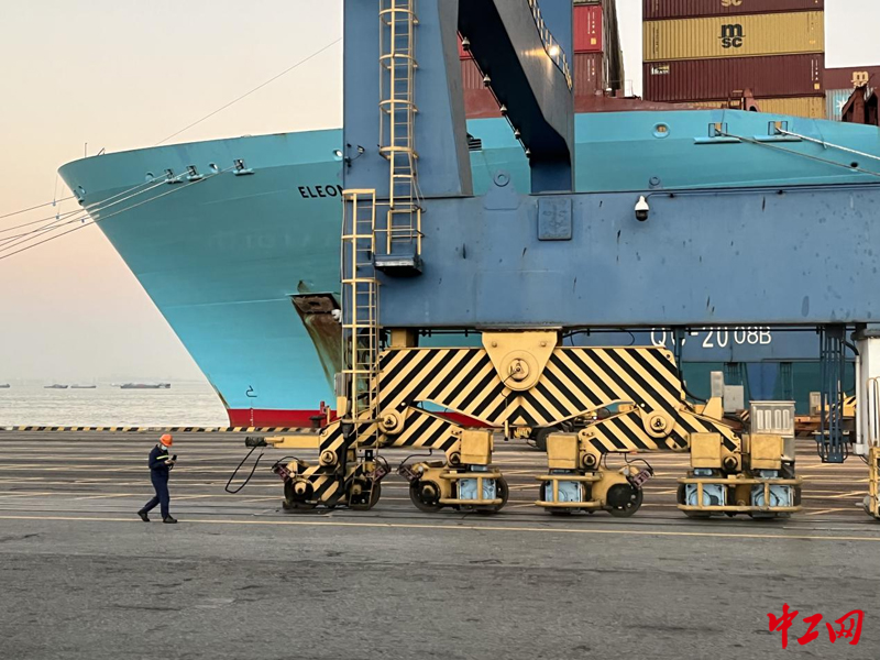 落日余暉下依舊在港口作業的工人。中工網 王天玥攝