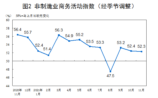 數(shù)據(jù)顯示,11月份,非制造業(yè)商務(wù)活動(dòng)指數(shù)為52.3%,比上月略降0.1個(gè)百分點(diǎn),繼續(xù)高于臨界點(diǎn),非制造業(yè)總體保持穩(wěn)定恢復(fù)。