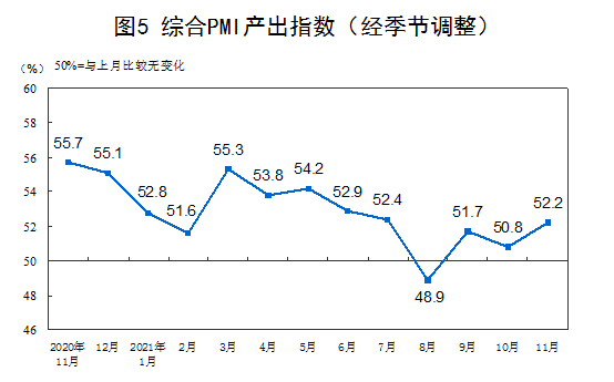 數(shù)據(jù)顯示,11月份,綜合PMI產(chǎn)出指數(shù)為52.2%,比上月上升1.4個(gè)百分點(diǎn)。