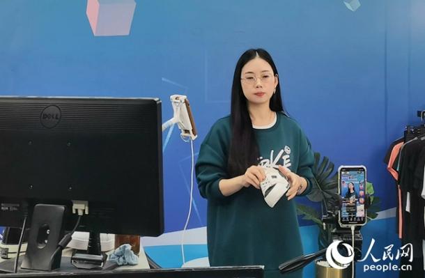 在泉州石獅青創城,一家鞋服企業正在直播。人民網 林曉麗攝