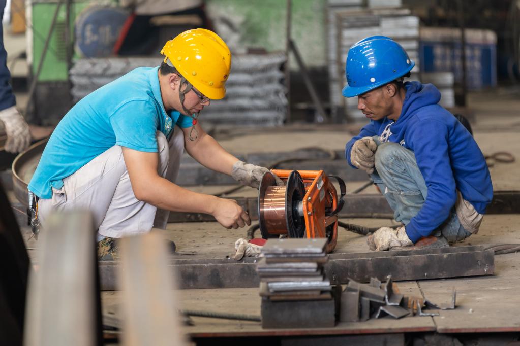 2019年11月7日,在老撾瑯勃拉邦,中國技術人員(左)在鋼筋加工廠教老撾工人檢修設備。