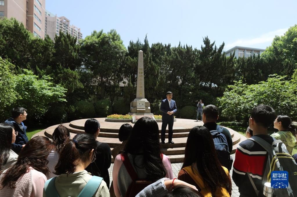 在上海交通大學校園里的史霄雯、穆漢祥烈士墓前,劉統教授在講述兩位烈士犧牲的歷史經過(2019年5月7日攝)。新華社記者劉穎攝