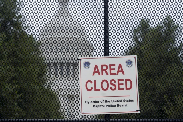 這是2021年9月17日在美國首都華盛頓透過隔離圍欄拍攝的國會大廈。美國華盛頓的國會周邊設置起金屬隔離圍欄,用于防范突發事件。(新華社記者劉杰攝)
