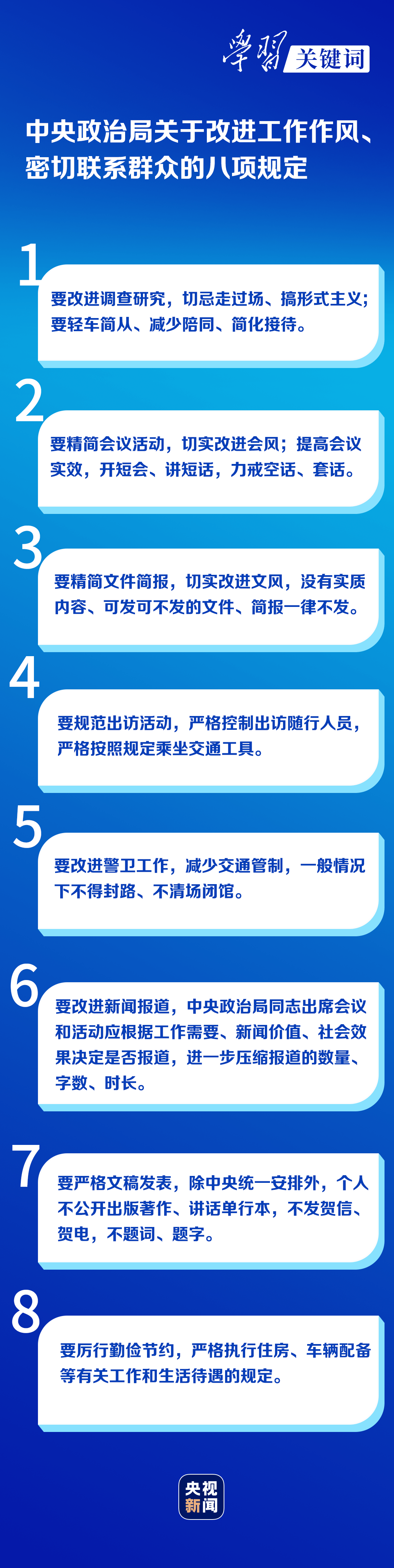 9年前的12月4日,中共中央政治局會(huì)議審議通過(guò)《十八屆中央政治局關(guān)于改進(jìn)工作作風(fēng)、密切聯(lián)系群眾的八項(xiàng)規(guī)定》,即“中央八項(xiàng)規(guī)定”。