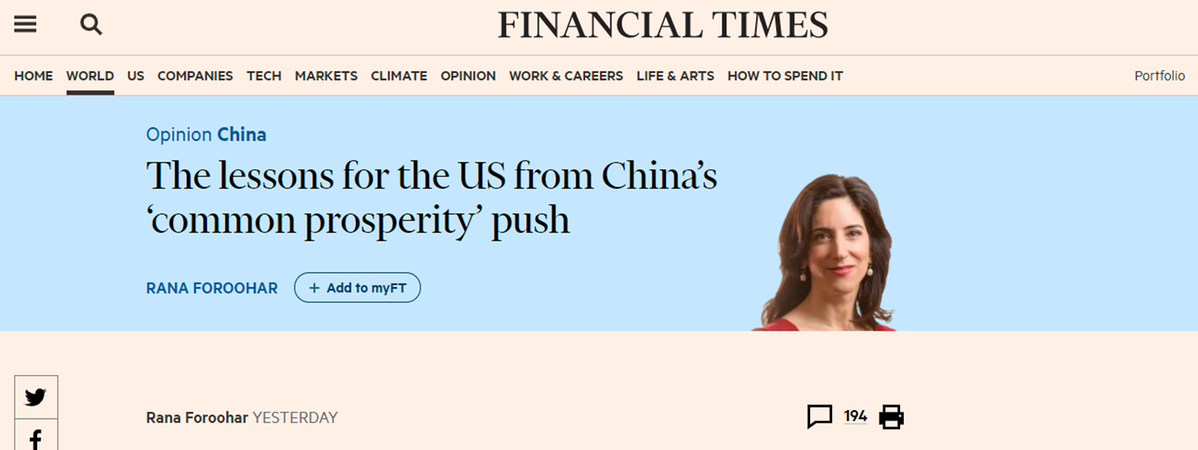 英國《金融時報》刊發評論文章稱,有關中國“共同富裕”的新聞已經進入到美國主流電視節目,美國應該學習中國推動共同富裕的經驗,特別是在經濟增長方面,更加注重質量而不是數量。