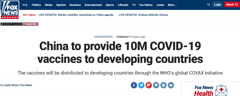 美國福克斯新聞網2月3日報道,應世衛組織方面請求,中方決定向“新冠疫苗實施計劃”(COVAX)提供1000萬劑新冠疫苗,主要用于發展中國家急需。