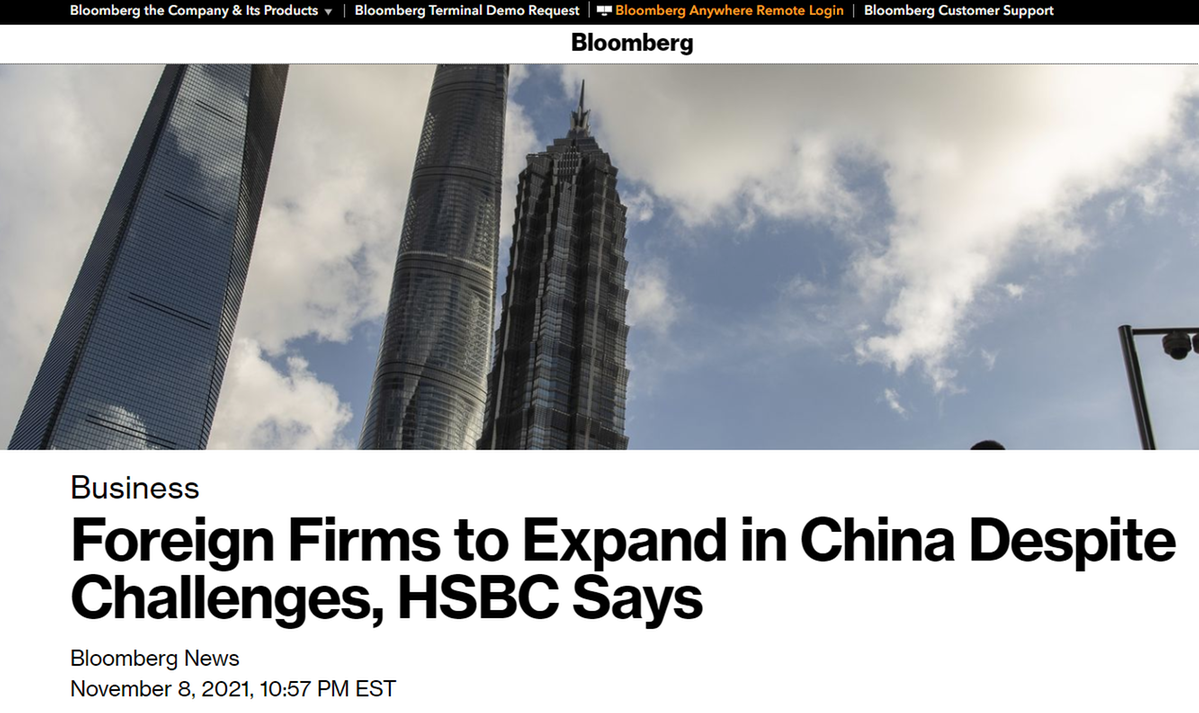 彭博社報道稱,匯豐銀行對2174家外資企業的調查顯示,97%的受訪企業表示,他們打算繼續擴大在華投資,因為中國擁有龐大的市場、經濟持續增長的預期以及發達完善的供應鏈。其中19%計劃將25%以上的盈利投資于中國,另有42%計劃將11%至25%的利潤投資于中國。
