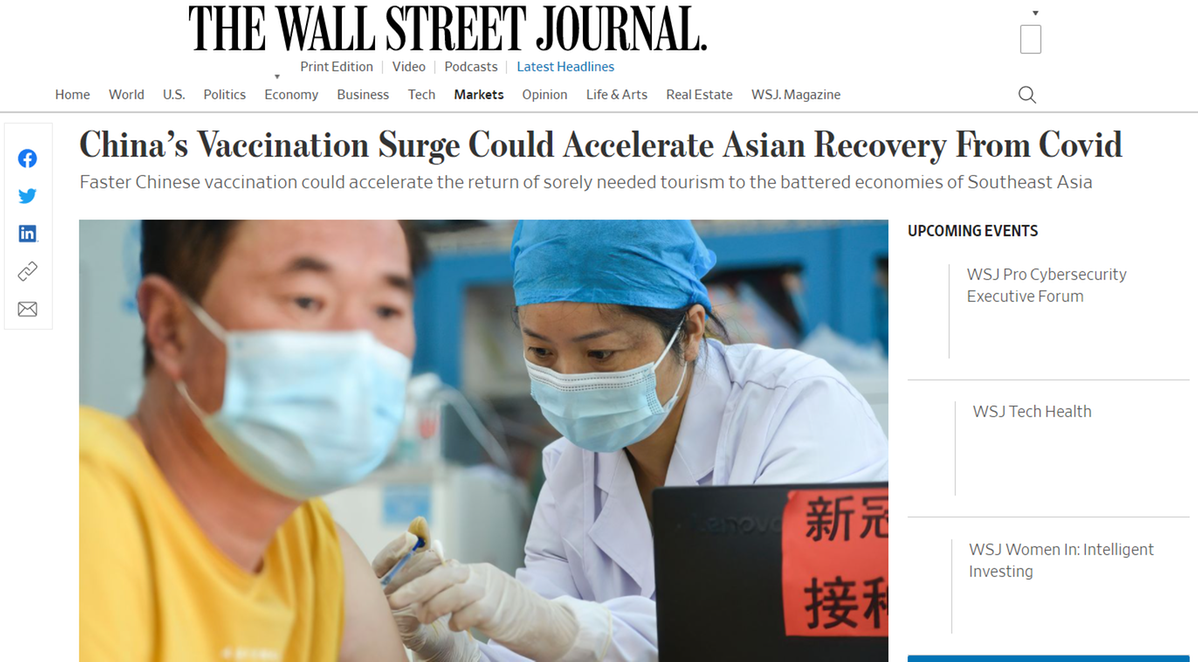 《華爾街日報》5月報道稱,中國疫苗接種速度不斷突飛猛進,如能保持該速度,將有望改變人們對亞洲乃至全球新興市場復蘇速度的預期。