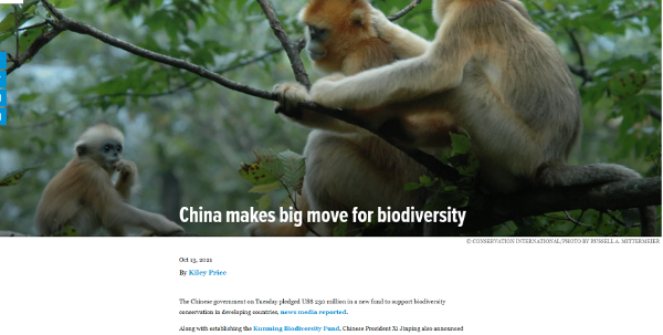 國際環保組織保護國際基金會(Conservation International)13日在官網發表文章稱,中國在生物多樣性方面邁出了重大步伐。