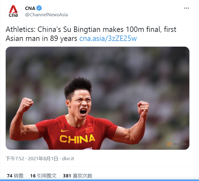 新加坡《海峽時報》報道直呼,蘇炳添真是太酷了!他讓世界感受到了亞洲速度。文章說,蘇教授在半決賽中跑得太快了,他讓我們相信亞洲人也能飛起來。