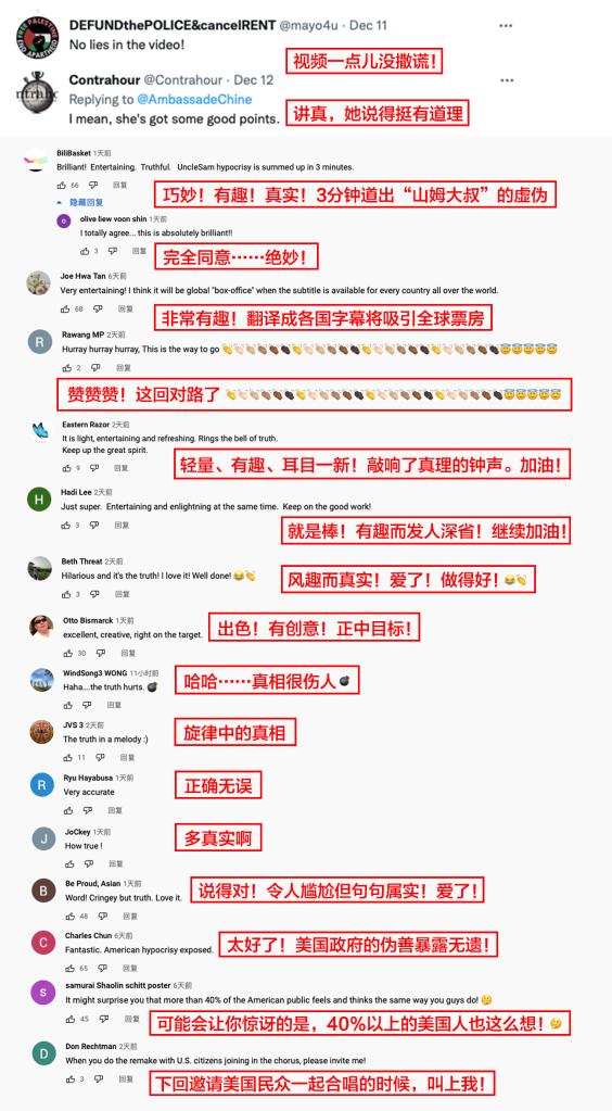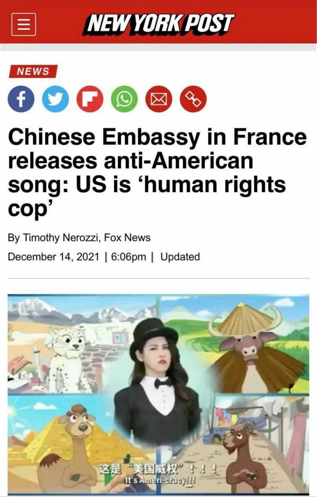 美國福克斯新聞網14日以《中國駐法國大使館發布批美歌曲:美國是“人權警察”》為題發文,報道了這一“由中國媒體制作,諷刺美國民主的視頻”。報道對視頻中的歌詞逐句解讀,稱“這些歌詞就一系列沖突對美國進行了譴責”,其中包括美國人權問題、選舉欺詐行為等。