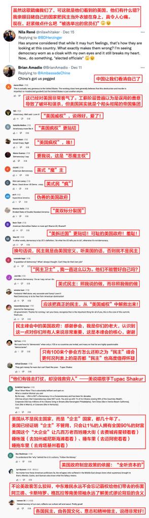 她的節目引發美國網友反思。有美國網友留言:“我親眼目睹自己的國家將民主當成外衣披在身上,這令我感到心痛。”美國政府用所謂的“民主、自由、人權”等一系列美麗詞匯掩蓋其虛偽本色,應該反思。