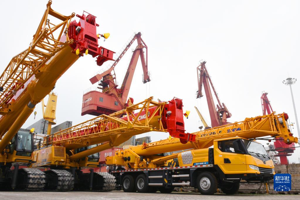 一批工程機械設備在江蘇連云港港口碼頭集結等待裝船出口(5月31日攝)。新華社發(耿玉和 攝)
