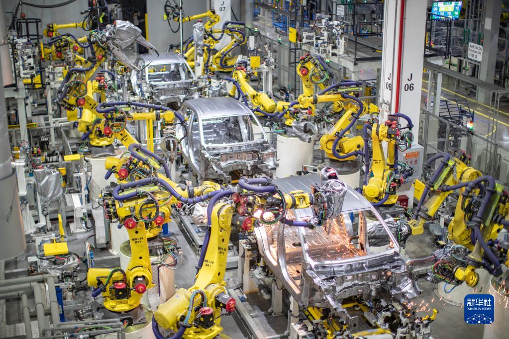 重慶一家新能源汽車企業使用智能化焊接機器人進行焊接作業(4月2日攝)。新華社記者 黃偉 攝