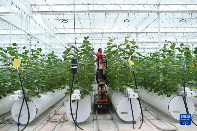 9月16日,工作人員在浙江省嘉興市一家農業數字化工廠的種植車間內乘軌道升降車對蔬菜進行日常管理。新華社記者 韓傳號 攝