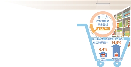 今年11月份的消費數據顯示,超市等實體零售業態增速加快。國家統計局貿易外經司統計師付加奇表示,前11個月,在限額以上單位有店鋪零售中,超市、倉儲會員店零售額同比分別增長6.4%和14.5%,增速分別比前10個月加快0.4個和1個百分點;便利店零售額增速與前10個月份持平,仍保持兩位數較快增長。