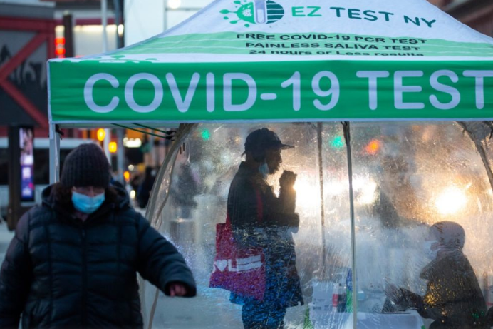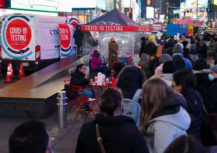 △12月20日,人們在美國紐約時(shí)報(bào)廣場排隊(duì)等待進(jìn)行核酸檢測。