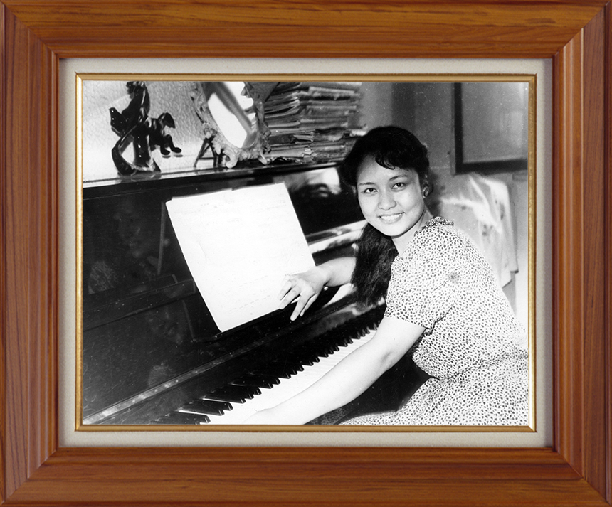 一張是彭麗媛年輕時坐在鋼琴前的單人照。