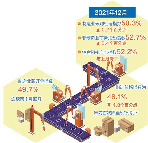 經(jīng)濟(jì)日報(bào)北京12月31日訊(記者熊麗)國家統(tǒng)計(jì)局服務(wù)業(yè)調(diào)查中心、中國物流與采購聯(lián)合會(huì)31日發(fā)布的數(shù)據(jù)顯示,2021年12月,制造業(yè)采購經(jīng)理指數(shù)和非制造業(yè)商務(wù)活動(dòng)指數(shù)分別為50.3%和52.7%,比上月上升0.2個(gè)和0.4個(gè)百分點(diǎn);綜合PMI產(chǎn)出指數(shù)為52.2%,與上月持平。