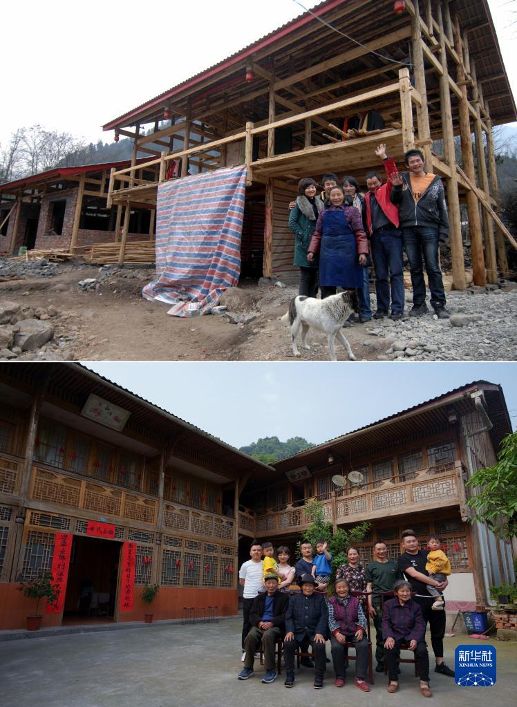 這是一張拼版照片,上圖為四川省綿陽市安州區高川鄉茅香村群眾林興聰(右二)、李蕓香(右三)和家中的老人、孩子在重建中的住房前留影(2009年1月25日,新華社記者江毅攝);下圖為林興聰(后右三)、李蕓香(后右四)一大家13口人在房前留影(2021年5月4日,新華社記者江宏景攝)。新華社發