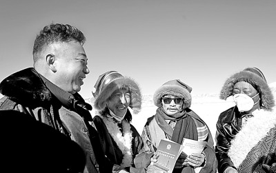青海省果洛藏族自治州瑪多縣人民法院法官(左一)為群眾普及法律知識。新華社發