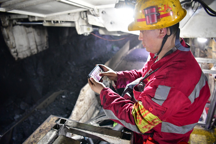 在曹家灘智慧礦山智能化工作面內(nèi),綜采二隊機(jī)電副隊長蔡進(jìn)通過操作手機(jī)控制生產(chǎn)設(shè)備。新華社記者邵瑞 攝