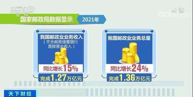 國家郵政局數據顯示,2021年我國郵政業業務收入(不含郵政儲蓄銀行直接營業收入)和業務總量分別完成1.27萬億元和1.36萬億元,同比分別增長15%和24%;快遞業務收入和業務量分別完成1.04萬億元和1085億件,同比分別增長18%和30%。新增社會就業20萬人以上,支撐網絡零售額接近11萬億元。