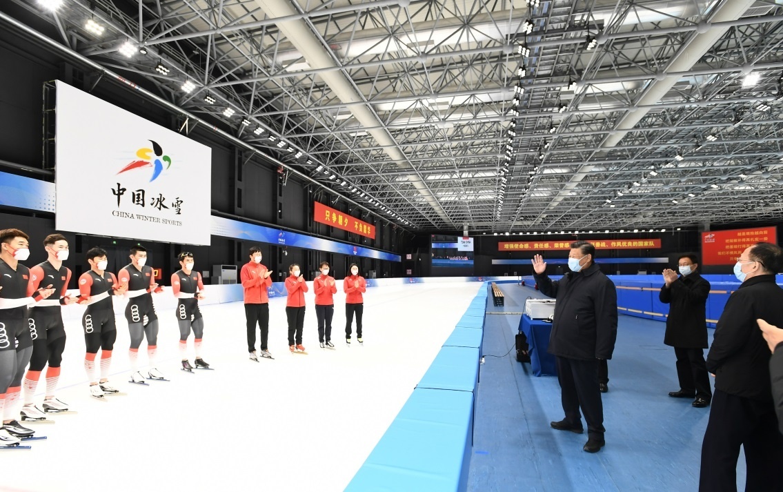 1月4日,中共中央總書記、國家主席、中央軍委主席習近平在北京考察2022年冬奧會、冬殘奧會籌辦備賽工作。這是4日下午,習近平在二七廠冰雪項目訓練基地速滑館,向參訓運動員、教練員表示慰問。