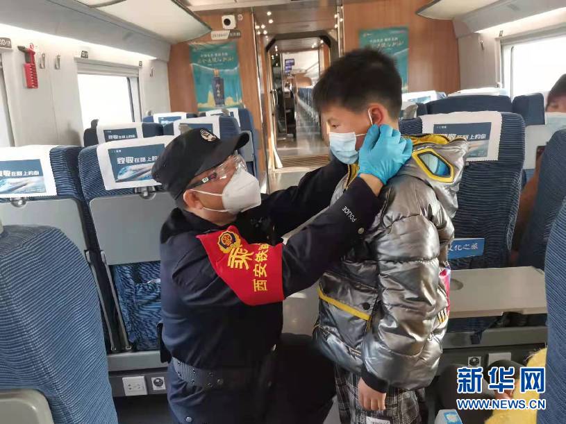 圖為乘警趙英斌在高鐵上教小朋友正確佩戴口罩(受訪者供圖)