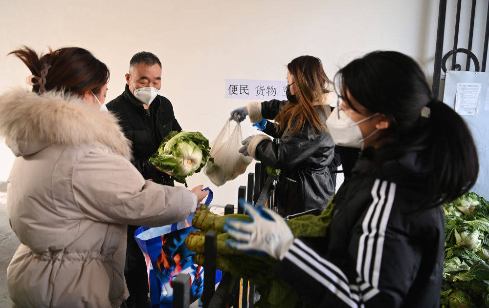 1月10日,雁塔區科技路一小區的工作人員在為居民配送愛心人士捐贈的蔬菜。新華社記者 陶明 攝