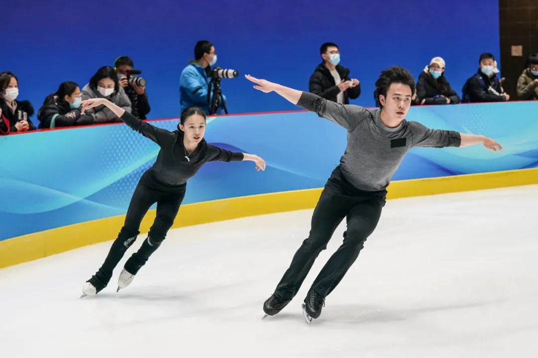 2022年1月5日,中國(guó)花樣滑冰國(guó)家集訓(xùn)隊(duì)在北京進(jìn)行北京冬奧會(huì)前最后一次公開訓(xùn)練,三對(duì)雙人滑組合在首鋼園冰上訓(xùn)練中心進(jìn)行了上冰訓(xùn)練。新華社記者 彭子洋 攝