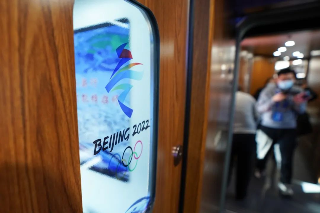 這是2022年1月6日在G9981次北京冬奧列車內(nèi)拍攝的北京2022年冬奧會(huì)會(huì)徽。新華社記者 鞠煥宗 攝