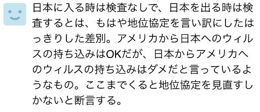 《沖繩時(shí)報(bào)》的報(bào)道在日本網(wǎng)絡(luò)上再次掀起爭議,有網(wǎng)民評論稱:“進(jìn)日本時(shí)不檢測,出日本時(shí)檢測,這已經(jīng)不能拿地位協(xié)定當(dāng)借口了,就是明明白白的歧視。就像是在說從美國將病毒帶進(jìn)日本,‘ok’;從日本將病毒帶進(jìn)美國,‘不行’。”