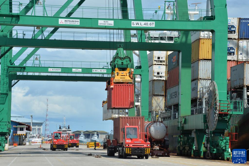 這是2022年1月1日拍攝的正在進行集裝箱裝卸作業的文萊摩拉港碼頭。文萊摩拉港由中國和文萊合資企業——摩拉港有限公司運營。新華社發(杰弗里·黃攝)