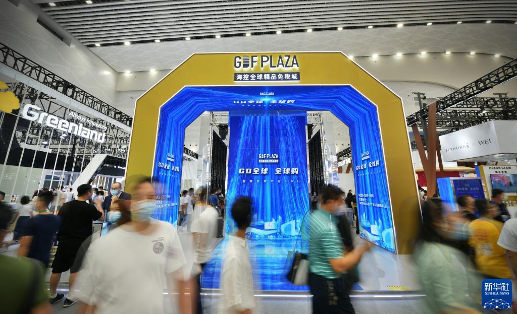 這是在海口舉行的首屆中國國際消費品博覽會(消博會)上的海控全球精品免稅城展臺(2021年5月9日攝)。新華社記者 蒲曉旭 攝