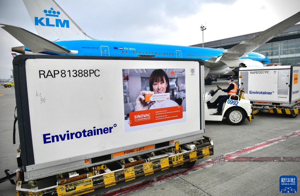 這是2021年3月6日在哥倫比亞波哥大埃爾多拉多國際機場拍攝的剛剛完成卸貨的科興疫苗。新華社發(哥倫比亞總統府供圖)
