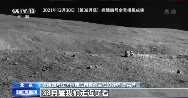 嫦娥四號任務地面應用系統主任設計師 高興燁:38月晝我們走近了看,這個不是一個小房子,實際上是一個石塊。我們發現石塊的寬度大概是20公分,高度大概是10公分,背后有一個比較大的撞擊坑,這個撞擊坑的直徑大概是22米。