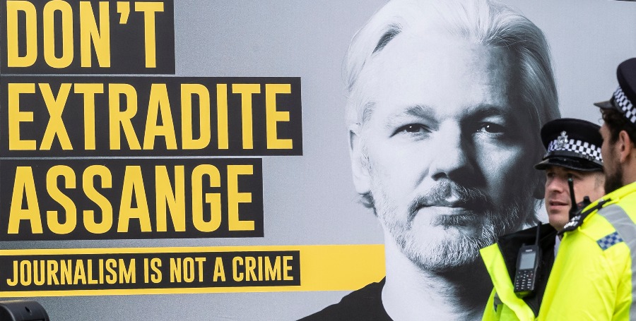 這張2020年9月8日拍攝的資料照片顯示,在英國倫敦議會大廈外,一輛寫有“不要引渡阿桑奇”標語的汽車從兩名警察身旁駛過。(新華社記者韓巖攝)