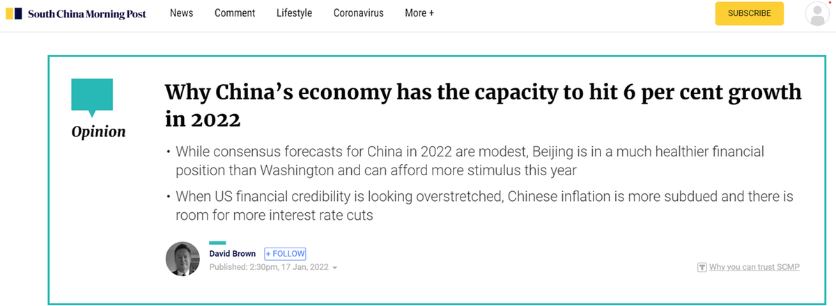 香港《南華早報(bào)》評(píng)論認(rèn)為,中國(guó)的金融狀況要比美國(guó)健康得多,政策空間很大。中國(guó)經(jīng)濟(jì)有能力在 2022 年實(shí)現(xiàn) 6% 的增長(zhǎng)。